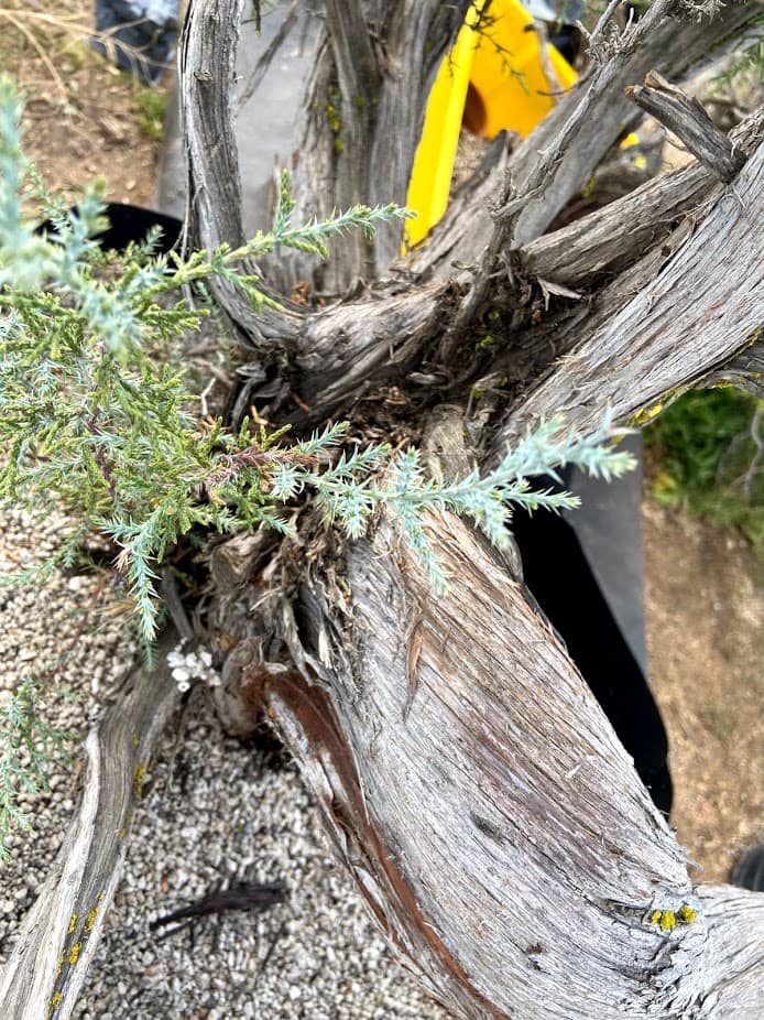 California Junipers are hard to collect. Unless you find one on top of a rock pocket in the mountains, you’d better be in the right season, with the right amount of rain recently, and know how to dig the root ball. If not, you’ll be greeted by hard dirt that breaks apart with ease, no surface roots to hold the root ball or survive with, and a dead tree.